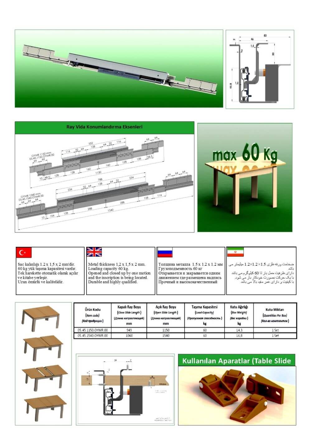 Üretilen Ray Uzunlukları :1000 mm - 1540 mm Sac Kalınlıkları : İç Ray: 1.50 mm / Dış Ray: 1.20 mm / İç-Dış Taşıyıcı Sac: 2.00 mm
